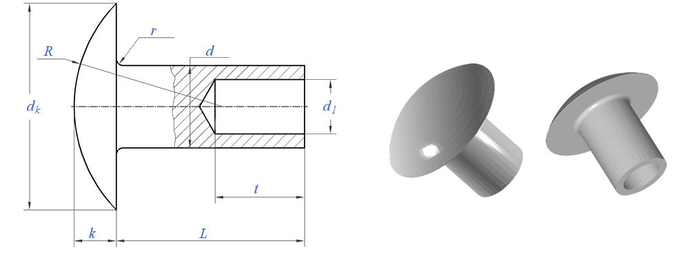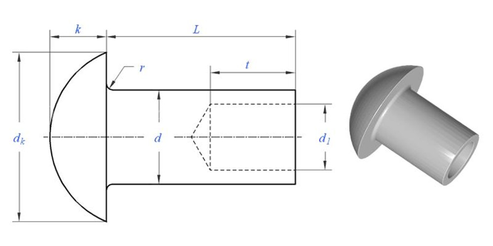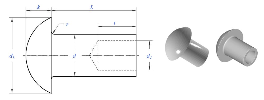 A 둥근 머리 반 구형 리벳 둥글고 돔 모양의 머리와 부분적으로 속이 빈 생크가있는 일종의 리벳입니다.