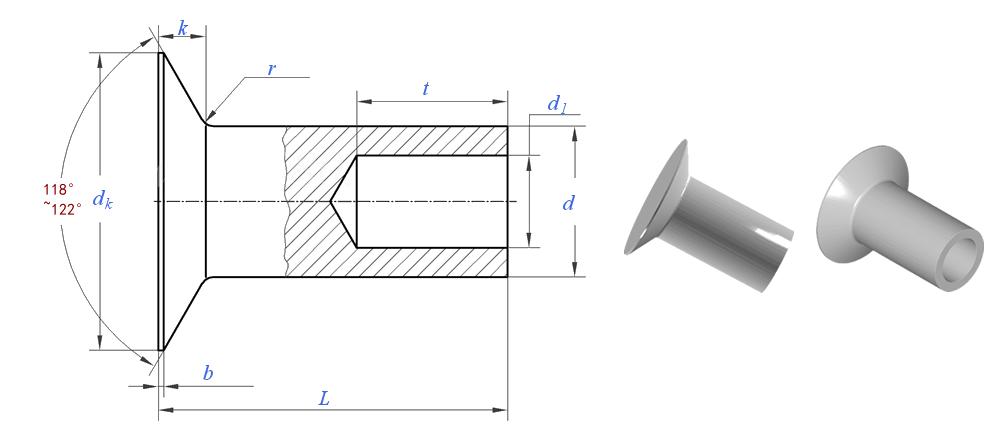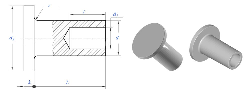 A 팬 헤드 반 구형 리벳 팬 헤드 (평평한 상단이있는 원통형 머리)와 부분적으로 속이 빈 생크가있는 리벳입니다.